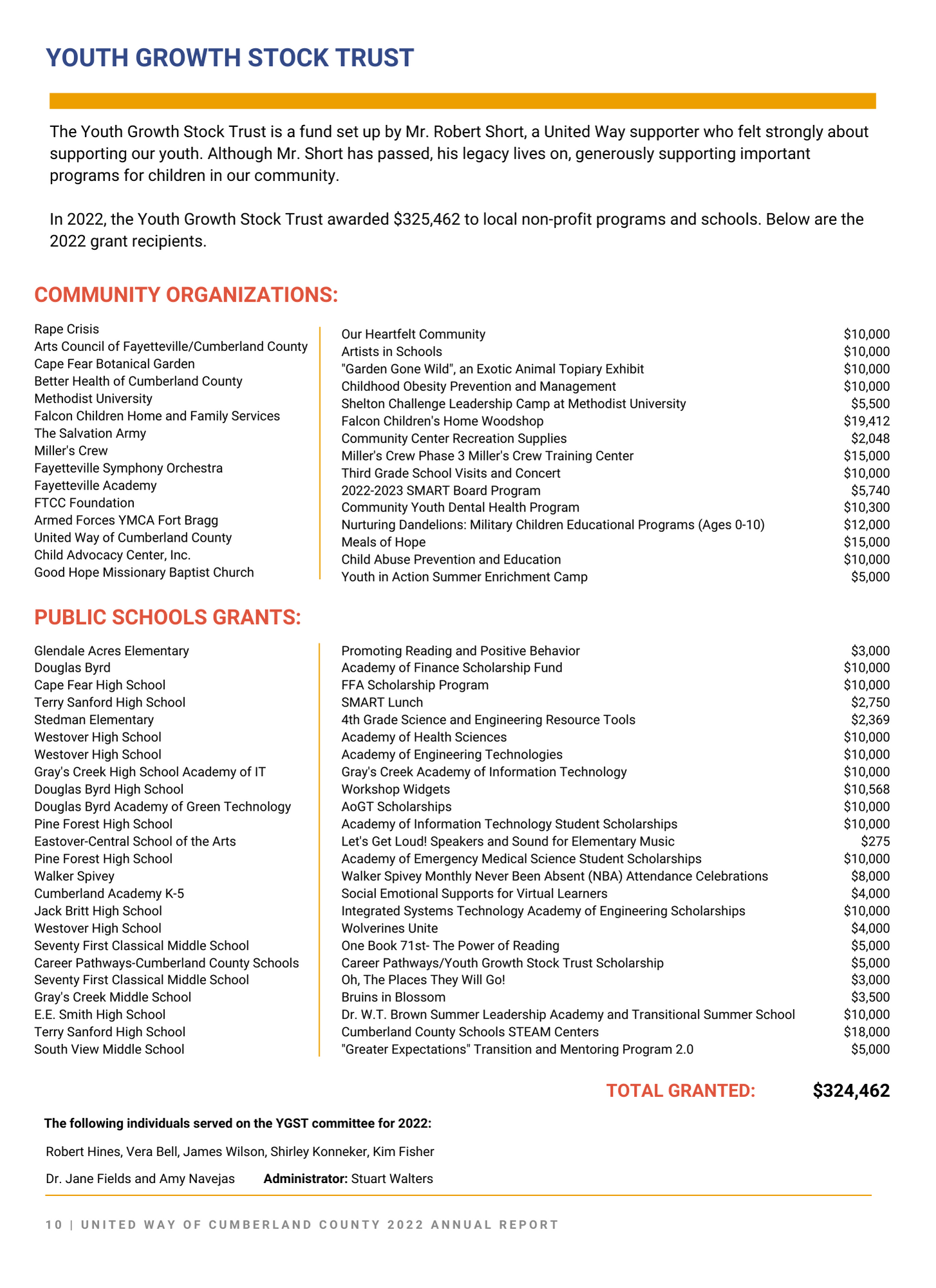 Mr. Short was also a strong supporter of the United Way. In 1992, he established the Youth Growth Stock Trust with United Way of Cumberland County as the administrator. The trust income can be granted annually for seed money, pilot programs, challenge grants, and/or matching gifts for projects, organizations, endeavors, and activities that benefit the youth of Cumberland County, NC educationally, physically, emotionally, health-wise, nutritionally, developmentally, recreationally, and in any other manner deemed beneficial to said youth. During his life, he was a generous philanthropist, donating millions to support educational initiatives and student scholarships. Robert H. Short wanted to help students have opportunities that he did not have.